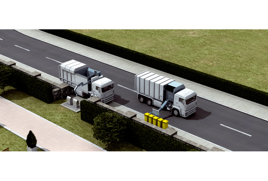 得益于智能测量值筛选器和温度补偿,直接安装在废物收集车辆抓臂上的超声波传感器 UM18 能够可靠地检测废物容器位置。因此,它可以准确定位抓臂,进而清空容器。安装在地埋式废物容器中的耐脏污型 UC30 可检测容器的临界装填度,随即发出清理请求。
